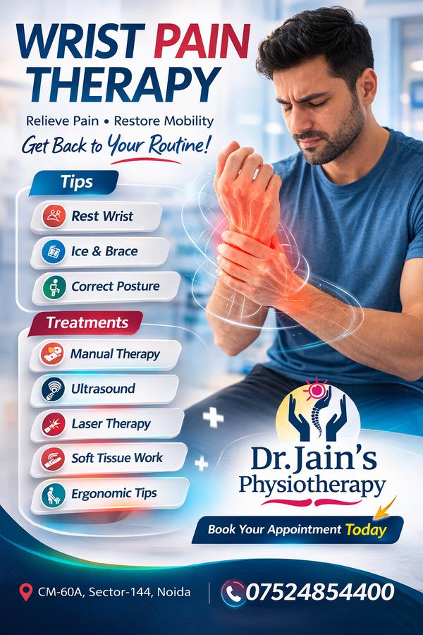 Wrist pain is a common problem that can affect people of all ages due to repetitive movements, injuries, or medical conditions. It can interfere with everyday activities such as typing, lifting objects, using a mobile phone, or performing household work. If wrist pain is not treated early, it can become chronic and lead to reduced hand strength and mobility.At Dr Jain's Physiotherapy, we provide advanced wrist pain physiotherapy treatment in Noida to help patients relieve pain, improve joint mobility, and restore normal hand function. Our treatment programs are designed for people suffering from wrist injuries, repetitive strain injuries, sports injuries, and work-related wrist pain.Common Causes of Wrist PainWrist pain can occur due to several reasons, including injuries, overuse of muscles, or medical conditions affecting the joints and nerves.Some common causes include:• Repetitive strain from typing or computer work• Sports injuries (cricket, badminton, tennis, gym workouts)• Wrist sprains or ligament injuries• Carpal Tunnel Syndrome• Arthritis in the wrist joint• Tendon inflammation (tendonitis)• Heavy lifting or manual labor• Poor ergonomics while using computers or mobile phonesIn India, many office workers, students, and manual workers experience wrist pain due to prolonged mobile and computer usage.Symptoms of Wrist PainThe symptoms may vary depending on the underlying cause but often include:• Pain in the wrist joint• Swelling or stiffness• Weak grip strength• Difficulty moving the wrist• Numbness or tingling in fingers• Pain while lifting or holding objects• Reduced hand mobilityIf wrist pain persists for several days or worsens during daily activities, it is important to consult a physiotherapy expert.Physiotherapy Treatment for Wrist PainPhysiotherapy is one of the most effective and non-surgical treatments for wrist pain. At Dr Jain's Physiotherapy, we provide customized therapy programs to reduce pain and restore normal wrist function.Our physiotherapy treatments may include:• Manual therapy to reduce stiffness• Ultrasound therapy for pain relief• Laser therapy to reduce inflammation• Soft tissue mobilization• Wrist strengthening exercises• Stretching exercises for flexibility• Ergonomic advice for daily activitiesThese treatments help improve blood circulation, reduce inflammation, and strengthen the wrist muscles.Benefits of Wrist PhysiotherapyPhysiotherapy treatment can provide several benefits, including:• Reduced wrist pain and inflammation• Improved wrist mobility• Increased hand strength• Faster recovery from injuries• Prevention of future wrist problems• Improved ability to perform daily activitiesWith proper physiotherapy and exercises, most patients experience significant improvement without surgery.Why Choose Dr Jain's Physiotherapy?At Dr Jain's Physiotherapy, we specialize in treating musculoskeletal conditions like wrist pain using modern physiotherapy techniques and personalized treatment plans.Our focus is on:• Accurate diagnosis of wrist problems• Customized rehabilitation programs• Advanced physiotherapy techniques• Long-term pain relief and injury preventionWe help patients return to their daily routine comfortably and safely.Book Appointment for Wrist Pain TreatmentIf you are suffering from wrist pain due to injury, sports activities, or prolonged computer use, consult an expert physiotherapist for proper treatment.Visit Dr Jain's Physiotherapy for professional wrist pain therapy and rehabilitation.📍 Address: CM-60A, Sector-144, Noida📞 Mobile: 07524854400🏥 Clinic Name: Dr Jain's Physiotherapy🌐 Website: www.drjainsphysiotherapy.com
