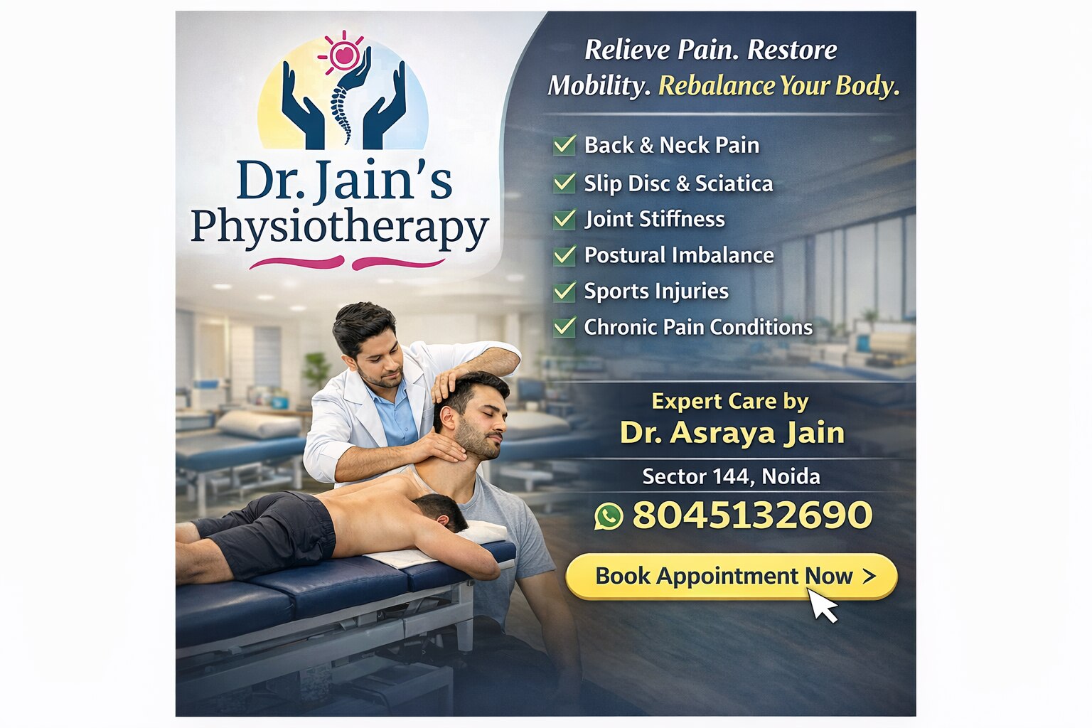 Centre with all advanced equipment and skilled staff for all your physiotherapy treatment needs. Experienced physiotherapist Dr Ashraya Jain(PT) with trained staff. Neat and clean environment. Well equipped OPD. Easy Wheel chair/ stretcher accessibility. Affordable prices. NEURO REHABILITATION Post stroke. Bell's Palsy. RTA/ Traumatic brain injuries. Paralysis physiotherapy/rehabilitation. Muscular dystrophy Parkinson's disease etc. ORTHOPAEDICS REHABILITATION Post operative Total knee/hip replacement care. Ligament injuries Post fracture exercise. Etc. PAIN MANAGEMENT Chronic pain/ Arthritis Sciatic/ Lower back ache Cervical spondylitis Frozen shoulder Carpal Tunnel syndrome etc. PAEDIATRIC REHABILITATION Cerebral palsy Development disorders Erb's palsy. Etc. SPORTS MEDICINE Ligament injuries Sprain/strain Joint injuries. Graston/IASTM Cupping/ Taping etc. GERIATRIC CARE Balance/Gait Training Strengthening exercises Mobility and flexibility etc