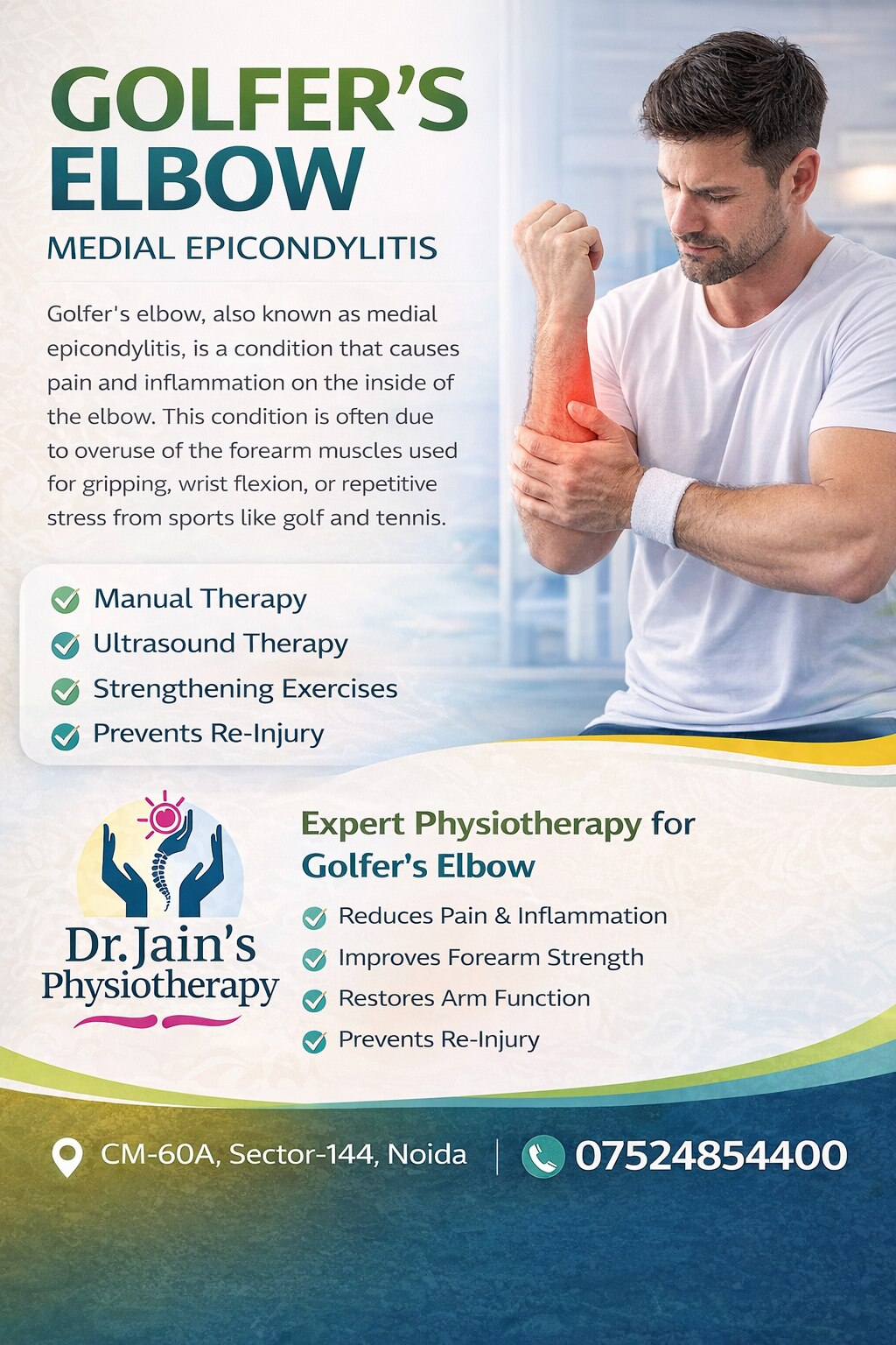 Golfer’s Elbow, medically known as Medial Epicondylitis, is a painful condition that affects the inner side of the elbow. It occurs due to overuse or repetitive stress on the forearm muscles and tendons that control wrist and finger movement. Although it is commonly associated with golfers, this condition can affect anyone who performs repetitive hand, wrist, or arm movements. At Dr Jain's Physiotherapy, we provide specialized physiotherapy treatment for Golfer’s Elbow in Noida to reduce pain, restore elbow function, and prevent future injury. Causes of Golfer’s Elbow Golfer’s Elbow develops due to repetitive strain on the forearm muscles and tendons attached to the inner elbow. Some common causes include: • Repetitive wrist and forearm movements • Overuse of forearm muscles • Improper sports technique (golf, tennis, cricket, badminton) • Heavy lifting or repetitive manual work • Frequent use of tools such as screwdrivers or hammers • Gym workouts with improper technique • Typing or computer work for long hours These repeated stresses cause small tears in the tendons that lead to pain and inflammation. Symptoms of Golfer’s Elbow People with medial epicondylitis may experience the following symptoms: • Pain on the inner side of the elbow • Tenderness around the elbow joint • Weak grip strength • Pain when bending the wrist or gripping objects • Stiffness in the elbow • Pain that may radiate into the forearm • Difficulty lifting objects or performing daily tasks Early treatment helps prevent worsening of symptoms and long-term complications. Physiotherapy Treatment for Golfer’s Elbow Physiotherapy is one of the most effective treatments for Golfer’s Elbow. At Dr Jain's Physiotherapy, we provide personalized treatment programs that focus on reducing pain and restoring muscle strength. Our physiotherapy treatments include: • Pain relief therapy • Manual therapy • Ultrasound therapy • Soft tissue mobilization • Stretching exercises • Strengthening exercises for forearm muscles • Posture and ergonomic correction • Activity modification advice These treatments help reduce inflammation, promote tendon healing, and improve arm strength.