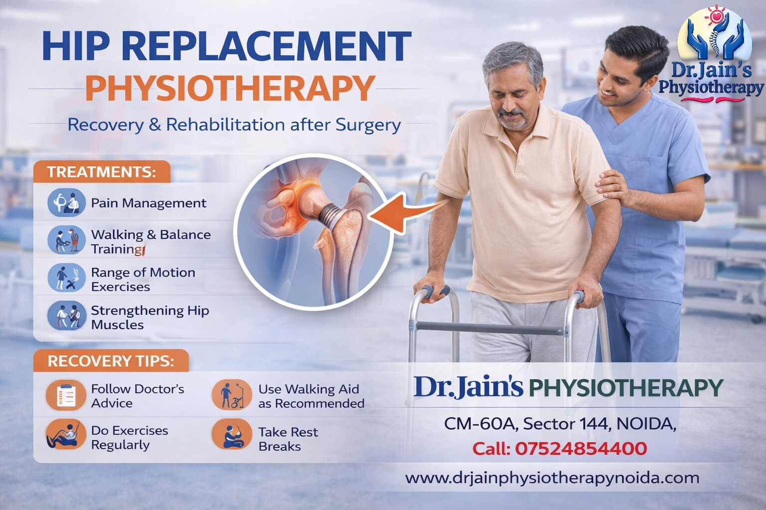 What is Hip Replacement Physiotherapy Hip replacement physiotherapy is a rehabilitation program designed to help patients recover after hip surgery. It focuses on: • Reducing post-surgical pain • Improving joint mobility • Strengthening surrounding muscles • Restoring walking ability • Preventing complications Without proper physiotherapy, recovery may be slow and incomplete. Importance of Physiotherapy After Hip Replacement Physiotherapy plays a key role in recovery. Benefits include: • Faster recovery and healing • Reduced pain and swelling • Improved joint movement • Increased muscle strength • Better balance and coordination • Reduced risk of complications such as stiffness or blood clots In Indian patients, early physiotherapy is important because many patients delay movement after surgery due to fear or lack of awareness. Common Problems After Hip Replacement After surgery, patients may experience: • Pain in the hip area • Swelling around the joint • Difficulty standing or walking • Muscle weakness • Limited range of motion • Fear of movement • Poor balance These problems can affect daily activities such as walking, sitting, and climbing stairs. Physiotherapy Treatment Phases Recovery is divided into different stages. Early Stage (0–2 Weeks) Focus is on basic movement and pain control. • Breathing exercises • Gentle leg movements • Bed mobility exercises • Sitting and standing training • Use of walker or support Intermediate Stage (2–6 Weeks) Focus is on improving mobility and strength. • Walking training • Range of motion exercises • Muscle strengthening • Balance training • Gradual increase in activity Advanced Stage (6 Weeks and Beyond) Focus is on returning to normal activities. • Advanced strengthening exercises • Gait correction • Functional training • Stair climbing practice • Endurance training Physiotherapy Techniques Used At Dr. Jain's Physiotherapy, treatment includes: Pain Relief Therapy Electrotherapy such as TENS therapy and ultrasound therapy helps reduce pain and swelling. Manual Therapy Joint mobilization improves flexibility and reduces stiffness. Strengthening Exercises Exercises focus on hip muscles, thigh muscles, and core strength. Range of Motion Exercises These exercises help restore normal joint movement. Gait Training Patients are trained to walk correctly using support if needed. Balance Training Improves stability and prevents falls. Precautions After Hip Replacement Patients must follow certain precautions to avoid complications. Important precautions include: • Avoid crossing legs • Do not bend hip beyond 90 degrees • Avoid sitting on low chairs • Use proper support while walking • Follow physiotherapy instructions regularly • Avoid sudden movements These precautions are important during the early recovery phase. Lifestyle Tips for Better Recovery Patients should follow simple lifestyle changes. • Maintain a healthy weight • Eat a balanced diet for healing • Stay physically active • Avoid prolonged bed rest • Use assistive devices as advised • Keep home environment safe to prevent falls Consistency in physiotherapy and daily routine is important. Hip replacement physiotherapy is an essential part of recovery after hip replacement surgery. The surgery involves replacing the damaged hip joint with an artificial joint to reduce pain and improve movement. However, surgery alone is not enough. Proper physiotherapy is required to restore mobility, strength, and function. In India, many patients undergo hip replacement due to severe arthritis, fractures, or joint damage. After surgery, patients often face difficulty in walking, stiffness, muscle weakness, and reduced confidence in movement. Physiotherapy helps patients regain independence and return to daily activities safely. At Dr. Jain's Physiotherapy, CM-60A, Sector 144, Noida, structured rehabilitation programs are provided for post-surgical hip replacement patients. For consultation, contact 07524854400 or visit http://www.drjainphysiotherapynoida.com
