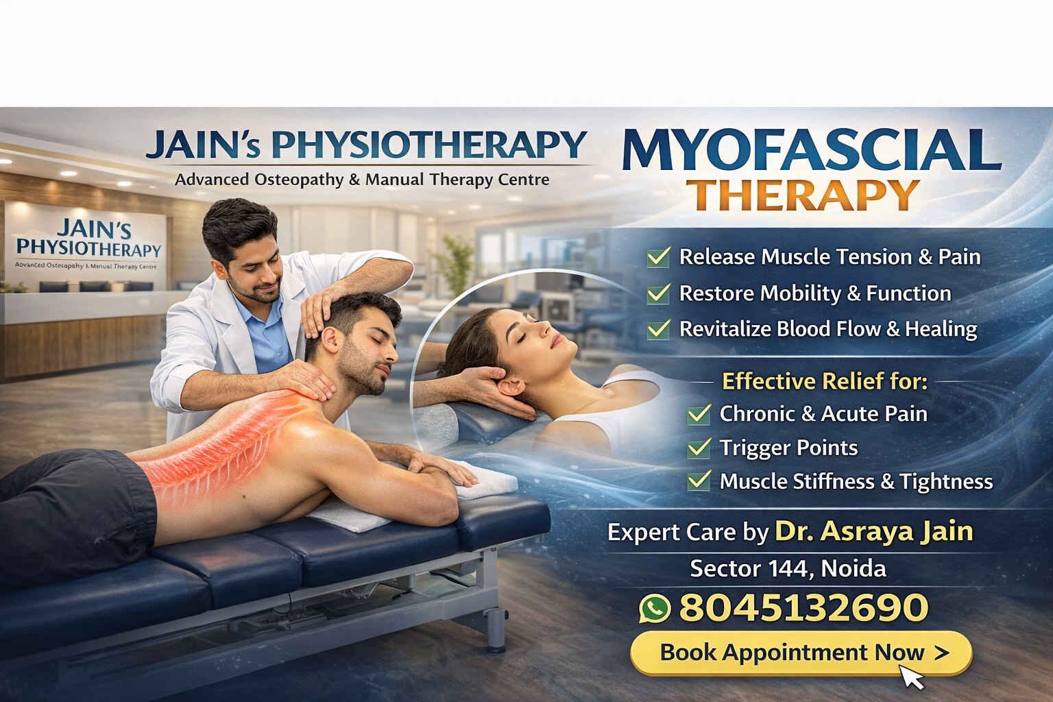 Myofascial Therapy (Myofascial Release Therapy) is an advanced hands-on physiotherapy technique offered at Jain's Physiotherapy to relieve chronic pain, muscle tightness, and movement restrictions. Fascia is a connective tissue layer that surrounds muscles, joints, and nerves. Due to injury, poor posture, stress, or overuse, fascia can become tight and painful. Myofascial Therapy gently releases these restrictions to restore mobility and reduce long-term discomfort. How Myofascial Therapy Works At Jain's Physiotherapy, our expert physiotherapists apply sustained, targeted pressure and slow stretching techniques to release tight fascial tissues and trigger points. This treatment helps to: Release deep tissue tension Improve blood circulation Reduce inflammation Restore joint mobility Improve posture and flexibility Promote faster recovery Conditions We Treat Myofascial Therapy at Jain's Physiotherapy is highly effective for: Chronic Back Pain Neck & Shoulder Pain Sciatica Slip Disc / Disc Bulge Frozen Shoulder Tennis Elbow Sports Injuries Muscle Spasm & Tightness Postural Problems Headaches & Migraine Benefits of Choosing Jain's Physiotherapy: ✔ Experienced & certified physiotherapists ✔ Personalized treatment plans ✔ Drug-free & non-surgical therapy ✔ Safe for all age groups ✔ Focus on long-term pain relief ✔ Modern physiotherapy setup Why Choose Myofascial Therapy? If you are suffering from long-standing muscle stiffness, recurring pain, or restricted movement, Myofascial Therapy addresses the root cause — fascial tightness — rather than just symptoms. At Jain's Physiotherapy, we ensure professional care, accurate assessment, and result-oriented treatment to help you move freely and live pain-free.