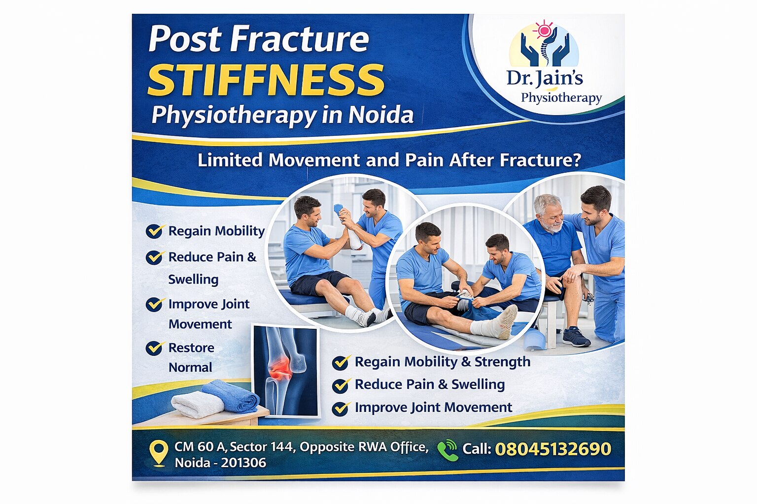 Fractures are common injuries that occur when a bone breaks due to trauma, accidents, sports injuries, or falls. While the bone may heal after medical treatment or surgery, many patients experience post fracture stiffness, which can significantly limit movement, cause discomfort, and affect daily life. Proper rehabilitation is essential to restore normal mobility and function. At Jain’s Physiotherapy, we specialize in post fracture stiffness treatment in Noida, helping patients recover mobility, reduce pain, and regain strength after bone injuries. Our physiotherapy programs are designed to improve joint flexibility, restore muscle strength, and support complete recovery. 📍 Clinic Address: Jain’s Physiotherapy CM 60 A, Sector 144, Opposite RWA Office, Noida – 201306 📞 Mobile: 08045132690 What is Post Fracture Stiffness? Post fracture stiffness refers to restricted movement and tightness in joints or muscles after a bone fracture heals. When a bone breaks, the affected limb is usually immobilized using a cast, splint, or surgery with plates and screws. During this period, the surrounding muscles and joints remain inactive for weeks, which can lead to stiffness. Even after the fracture heals, patients may struggle with: • Limited joint movement • Muscle weakness • Pain during movement • Difficulty performing daily activities Without proper physiotherapy rehabilitation, post fracture stiffness can persist for months or even become permanent. At Jain’s Physiotherapy in Noida, we provide specialized rehabilitation programs to restore normal movement and prevent long-term complications after fractures. Common Causes of Post Fracture Stiffness Several factors contribute to stiffness after a fracture. 1. Immobilization When a limb is kept in a cast for several weeks, the joints and muscles become stiff due to lack of movement. 2. Scar Tissue Formation After injury or surgery, scar tissue may develop around the joints, restricting movement. 3. Muscle Weakness Muscles lose strength when they are not used during the healing phase. 4. Joint Inflammation Swelling and inflammation around the fracture site can limit mobility. 5. Pain and Fear of Movement Patients often avoid moving the affected limb due to pain or fear of re-injury, which further worsens stiffness. Physiotherapy helps address these issues through guided exercises and therapeutic techniques. Symptoms of Post Fracture Stiffness Patients suffering from post fracture stiffness may experience the following symptoms: • Reduced joint movement • Difficulty bending or straightening the limb • Pain while moving the joint • Muscle tightness • Swelling around the joint • Weakness in the affected area • Difficulty walking or using the injured limb If these symptoms are ignored, they can lead to long-term mobility problems. Early physiotherapy treatment is essential for better recovery. Common Fractures That Cause Stiffness Post fracture stiffness can occur after fractures in different parts of the body. Wrist Fractures Stiffness after wrist fractures can affect hand movements and grip strength. Elbow Fractures Elbow stiffness can limit the ability to bend or straighten the arm. Shoulder Fractures Shoulder injuries may restrict arm movement and cause pain during lifting. Hip Fractures Hip fractures often lead to difficulty walking or standing. Knee Fractures Stiffness in the knee joint can affect walking, climbing stairs, or sitting. Ankle Fractures Ankle stiffness can cause balance problems and difficulty walking. At Jain’s Physiotherapy, we provide specialized rehabilitation programs for different types of fractures. Importance of Physiotherapy for Post Fracture Stiffness Physiotherapy plays a crucial role in restoring normal movement and preventing long-term complications after fractures. Key Benefits of Physiotherapy 1. Restores Joint Mobility Physiotherapy exercises help improve flexibility and restore normal joint movement. 2. Reduces Pain and Swelling Therapeutic techniques reduce inflammation and discomfort. 3. Improves Muscle Strength Strengthening exercises help rebuild muscles weakened during immobilization. 4. Prevents Permanent Stiffness Early physiotherapy prevents joints from becoming permanently restricted. 5. Improves Balance and Coordination Patients regain confidence while walking or performing daily tasks. 6. Enhances Overall Recovery Physiotherapy ensures a faster and more effective recovery after fractures. At Jain’s Physiotherapy, we focus on safe and effective rehabilitation for complete recovery. Post Fracture Stiffness Treatment at Jain’s Physiotherapy At Jain’s Physiotherapy in Noida, we provide comprehensive physiotherapy treatment designed to improve mobility and strength after fractures. Initial Assessment The treatment begins with a detailed evaluation of the patient’s condition. Our physiotherapists assess: • Type of fracture • Duration of immobilization • Pain level • Joint range of motion • Muscle strength • Functional limitations Based on this assessment, we create a personalized rehabilitation plan.
