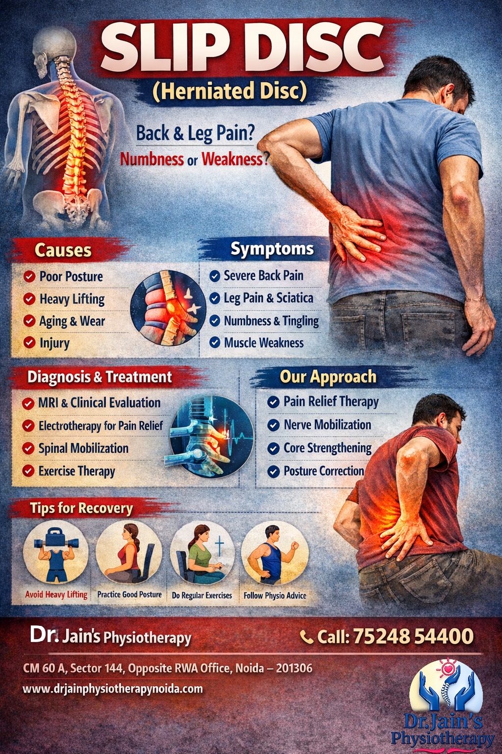At Jain’s Physiotherapy, we provide structured physiotherapy treatment for slip disc to reduce pain, improve mobility, and prevent recurrence. Our approach focuses on non-surgical management and long-term recovery. What is Slip Disc The spine is made up of bones called vertebrae, separated by discs that act as shock absorbers. When a disc bulges or ruptures, it can press on nerves, causing pain and discomfort. This condition is commonly seen in the lower back (lumbar spine) and sometimes in the neck. Slip disc is not always due to sudden injury. In many cases, it develops gradually due to poor posture and continuous stress on the spine. Common Causes of Slip Disc Prolonged sitting, especially in office jobs Poor posture while working or using mobile Lifting heavy objects incorrectly Lack of physical activity Aging and wear of spinal discs Sudden jerks or injury In Indian lifestyle, long sitting hours and improper seating arrangements contribute significantly to this condition. Symptoms of Slip Disc Lower back pain Pain radiating to leg (sciatica) Numbness or tingling sensation Muscle weakness Difficulty in bending or sitting Pain while standing for long time Ignoring these symptoms can lead to worsening of condition and long-term problems. At Jain’s Physiotherapy, we focus on relieving nerve pressure and improving spinal stability. Why Choose Jain’s Physiotherapy Personalized treatment plans One-to-one patient care Focus on root cause treatment Use of advanced physiotherapy techniques Regular progress monitoring We focus on practical recovery so patients can return to daily life without pain. Home Care Guidance We guide patients for home care: Daily exercise routine Correct sitting and sleeping posture Activity modification Gradual return to normal work This ensures long-term recovery and prevention. Clinic Details Jain’s Physiotherapy Address: CM 60 A, Sector 144, Opposite RWA Office, Noida – 201306 Mobile Number: 0752485440 Website: www.drjainphysiotherapynoida.com�